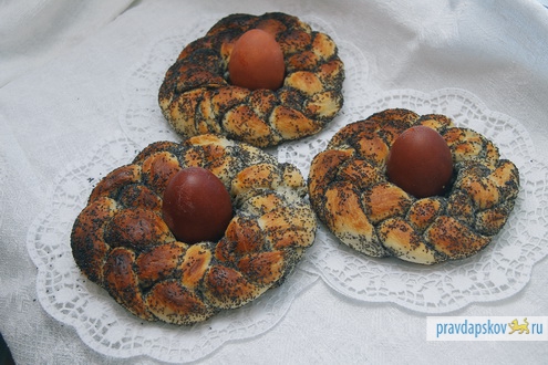 Противень слегка смазать маслом и присыпать мукой. Уложить плетенки, в центр каждой поставить вареное яйцо (чтобы серединка не «закрылась» во время выпечки), смазать яйцом и дать постоять минут 15-20.