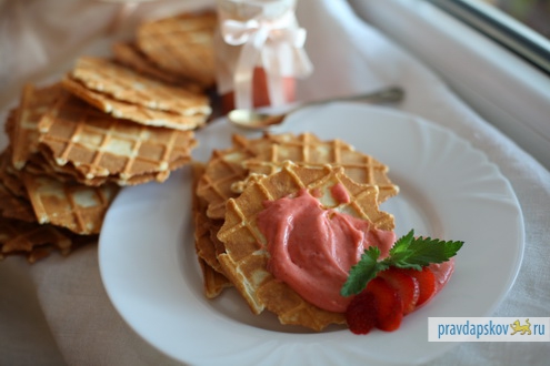 Ну и напоследок, конечно же, любимый всеми рецепт из детства: домашние вафли! Наверняка у многих дома, где-нибудь в глубине дальнего шкафа, хранится старая вафельница, которая вроде и не используется, и выбросить жалко. Так вот, сейчас самое время стряхнуть с нее пыль времен! Все ведь любили вафельные трубочки с кремом? Вспомните, как это было вкусно! А в качестве дополнения и в развитие сегодняшней темы, приготовим клубничный курд. Яркий, удивительно ароматный и шелковистый крем заставит мгновение замереть!