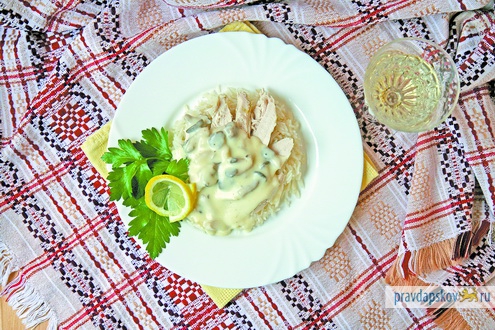 Добавить лимонный сок, грибы, приправить по вкусу солью и перцем и готовить еще пару минут, постоянно помешивая. Если соус получился слишком густым, разбавьте его бульоном.