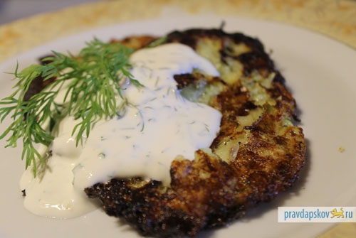 Отдельно смешайте йогурт или сметану с лимонным соком и зеленью, посолите и поперчите по вкусу. Получившийся соус подайте вместе с оладушками.