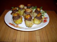 Фарш с луком обжарить, перемешать и нафаршировать им картофель. Поставить в духовку на 30 минут. Запекать при температуре 30 градусов. Приятного аппетита!