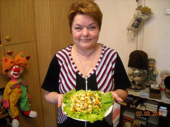 Все это украсить листьями салата и заправить майонезом.