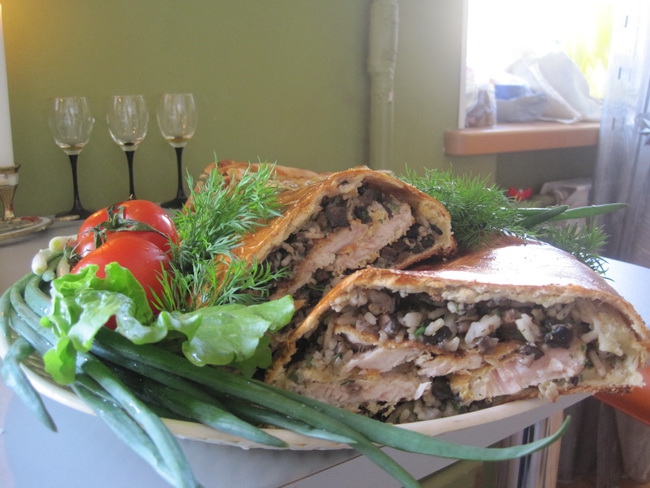 Мясной рулет с грибами и рисом