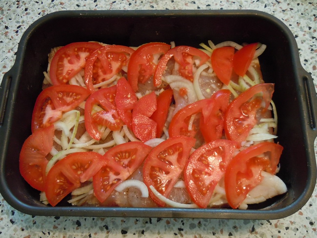 3 – Затем выкладываете помидоры (кто хочет – болгарский перец, лучше цветной, так просто красивее).