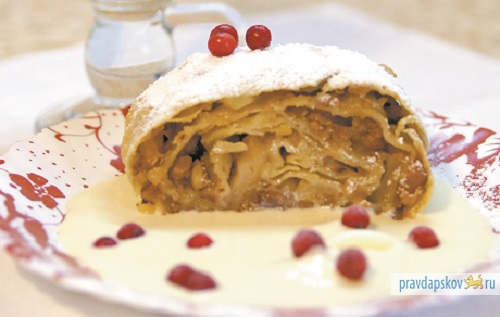 Для начала немного истории. Исторической родиной венского штруделя является… Византийская империя. Именно там было придумано тесто филло (в переводе с древнегреческого означает «лист») – пресное, бездрожжевое и очень тонкое вытяжное тесто. Собственно, из такого теста, а вовсе не из слоеного, как это принято считать, и готовится классический штрудель. Эффект слоености достигается за счет того, что тесто раскатывается очень тонко (толщина пласта не должна превышать одного миллиметра) и укладывается в несколько слоев.
