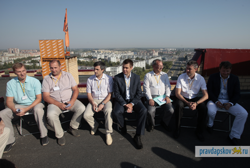 Что из этого планы, а что мечты, «Псковская правда» выяснила, находясь на крыше самого высокого здания в Пскове. Именно здесь накануне профессионального праздника удалось собрать первых лиц строительной отрасли региона. Этот любопытный проект – круглый стол на крыше высотки – стартовал благодаря нашим коллегам по медиахолдингу – «Комсомольской правде».Время действия: знойный июльский полдень. Место действия: крыша (фактически – 19-й этаж) самого высокого жилого дома Пскова, 18-этажки на Рижском, 70. Здание стоит на границе ближнего и дальнего Завеличья, проходящей по ул. Юбилейной. С его крыши две территории одного городского района выглядят как два мира. В старом трудно разглядеть конкретные здания, они тонут в зеленой листве. В мире новом коробки из стекла и бетона видны отчетливо.