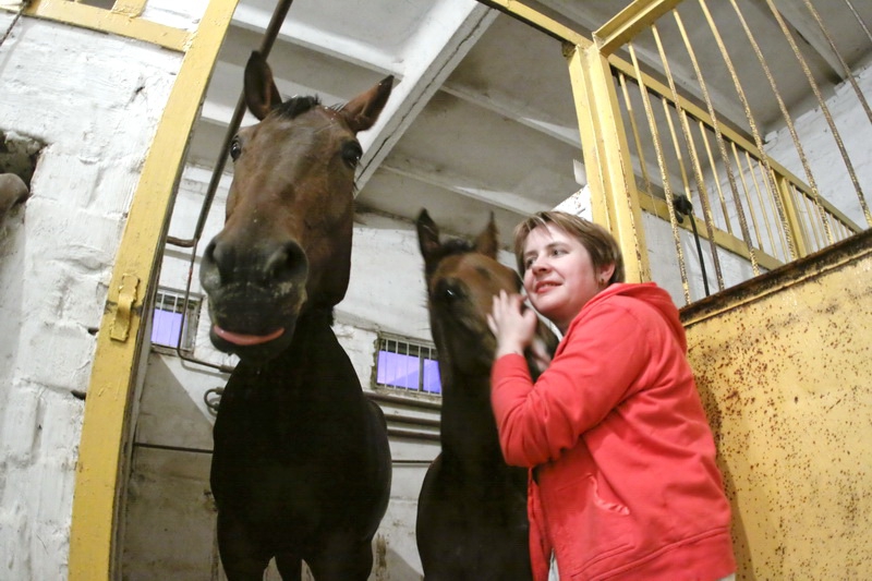 С первых дней на жеребят периодически надевают и снимают недоуздки – своего рода мягкие уздечки. Это считается первым этапом заездки. А еще обучают работать с голоса. На манеж выпускают кобылу с жеребенком. Взрослой лошади подают голосом команды: шагом, рысь, галоп. Жеребенок копирует движения матери и постепенно запоминает команды. Первые уроки жеребенку дает берейтор – тренер лошади. Диогена обучает Надежда Антонова, берейтором Подснежника является Марина Анисимова.