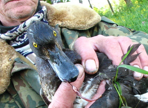 Как и когда подобрались воришки к моей кормушке, лежащей на дне пруда, я не заметил. А вот долгожданная поклевка была явной. Подсекаю! И сразу понимаю, что не рыба это, в моих крючках запуталась-зацепилась. Уточка всплыла и пыталась освободиться. Я же подтаскивал снасть с «уловом» к берегу и молил небеса, чтобы не оборвалась леска. Порвется – кто потом освободит пленницу. А попалась она крепко - крючок насквозь пронзил верхнюю и нижнюю часть клюва, а леска намоталась вокруг крыла. Плюс ко всему мешал верный селезень, шумно с брызгами подплывал несколько раз к самке, пытаясь отпугнуть невидимого врага и рискуя запутаться или оборвать снасть. Шум на весь пруд. Минуты через две после аккуратного выуживания, птица оказалась у меня в руках. Сердечко у воришки стучало так сильно и часто, что, казалось, вот-вот выскочит из пушистой груди. Сосед по рыбалке помог мне выпутать проказницу и мы ее торжественно отпустили. Улепетывала «северянка» на середину пруда со скоростью моторной лодки. Еще бы, такой стресс испытала! Тут же подлетел селезень и пара успокоилась, начала чистить перышки, махать крыльями и нырять, как ни в чем не бывало..