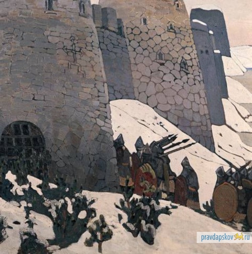 Зато мы с уверенностью можем сказать и не погрешим против истины, что художник черпал вдохновение, глядя на старые крепостные стены. Во-первых, художники черпают вдохновение везде, а во-вторых, после посещения Изборска Николай Рерих оставил нам на радость несколько вполне осязаемых материальных шедевров.