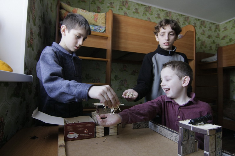 Автор произведения – Илья во время нашего визита был в школе, поэтому на фоне его спичечной крепости, начатой два дня назад, позировали братья.