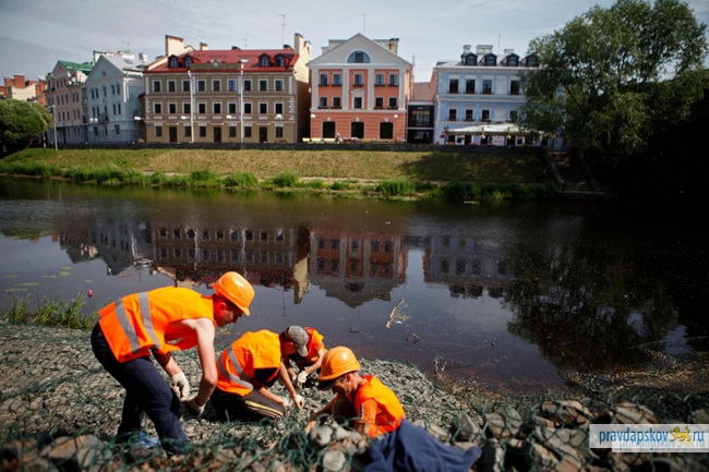 На берегу Псковы в настоящий момент трудится 12 рабочих. Кирилл Жемчугов пообещал, что до конца недели их число планируют увеличить до 50 человек.