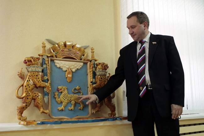 Правда, увидеть своими глазами журналисты смогли пока только парадный герб, выполненный из дерева. «Псковская правда» уже не раз писала о том, что из себя представляет новый городской символ; поэтому не буду подробно описывать все новшества. Отмечу лишь, что девиз «Чести своей не отдам никому» в итоге написан не на латыни, а по-русски. Кроме того, журналисты обратили внимание на необычный окрас барсов (напомню, что их на гербе теперь три: к привычному добавились еще два – по словам Ивана Цецерского, это князья Довмонт и Всеволод-Гавриил в обличье барсов). Глава города пояснил, что существующий вариант парадного герба был изготовлен всего за две недели и требует художественной доработки.