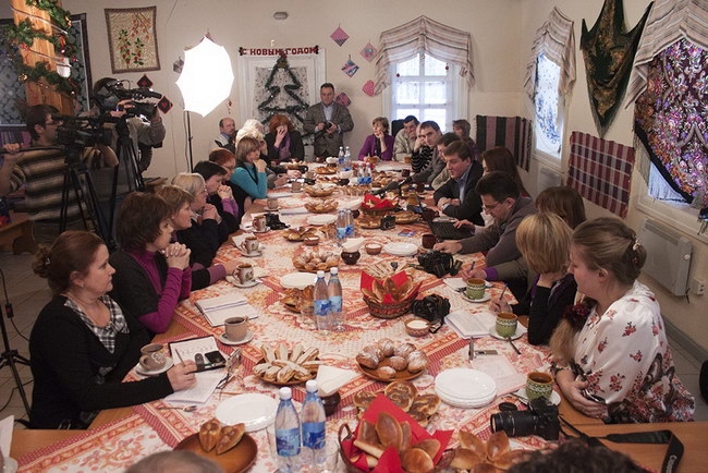 Встреча проходила на выезде, под Пушкиногорьем, в селе Бугрово, в трактире, и была организована в уже традиционном формате «без галстуков». Впрочем, отсутствие галстуков, общий стол, чай и пирожки – вот и все отличия такого общения от стандартной пресс-конференции.