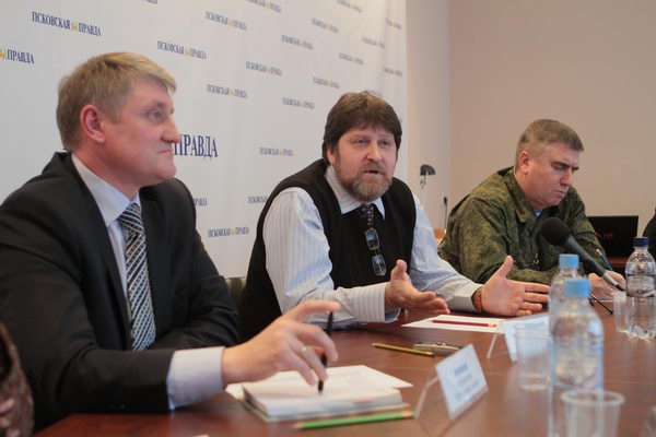К журналистам пообщаться их пришло четверо: сам Георгий Василевич, предприниматель и депутат Великолукской гордумы Сергей Сергиенков, ректор ПОИПКРО Людмила Фомичёва и командир 76-й дивизии Игорь Виноградский.