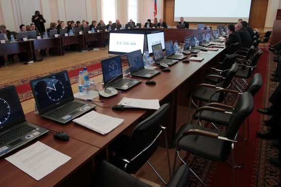 Сергей Макарченко (в середине) успешно осваивает работу на сессии Собрания. Правда, рук не всегда хватает