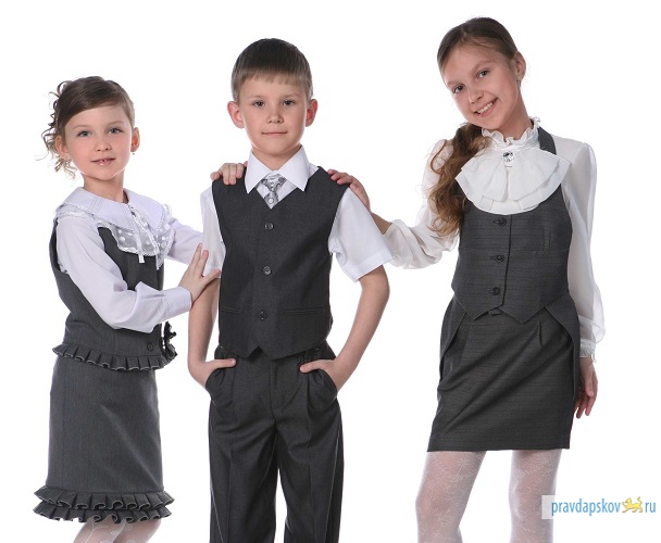 Родители отдали предпочтение черному цвету (клетка), хотя выбрать можно было темно-зеленую форму, темно-синюю, бордовую или серую. Комплектация для мальчиков: брюки, жилетка, пиджак. Для девочек: сарафан и пиджак. Форму заказывали в ООО «Премир» (п. Красногородск Псковской области).