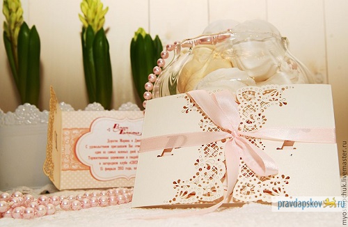 3. Декорации из ткани Если аккуратно вырезать детали из бумаги и ткани выше ваших сил, купите в магазинах рукоделия атласные цветочки: они добавят изящества вашему приглашению. В ход также могут пойти кружево, бантики, бисер, который можно рассыпать на тонком слое клея или пришить заранее к кружеву. Главное – не переусердствуйте с дизайном. Деталей не должно быть много.
