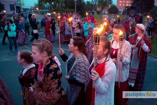 Мероприятие открылось «Псковским разгуляем» на площади Ленина в 21.00, где были представлены участники фестиваля. Затем состоялось факельное шествие по улицам города от площади Ленина на Троицкий мост и на Золотую набережную. Здесь участники фестиваля представили водную прогулку «Поющая река» от Троицкого моста до Воскресенской башни. Исполняя народныепесни, участники фестиваля прошлись по берегу и проплыли в лодках.
