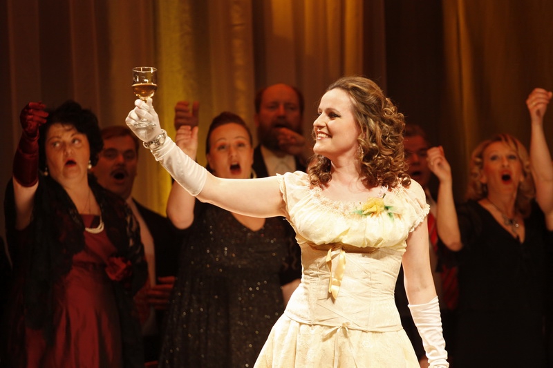 Эстонский режиссер Неэме Кунингас для того, чтобы показать роскошный особняк куртизанки Виолетты Валери, не стал загромождать сцену декорациями. Режиссер ограничился обычными стульями. Весь реквизит спектакля – дюжина бокалов и семь бутылок из-под вина. Все остальное – скрытые резервы, которые были у профессиональных солистов и любителей, исполнявших роли второго плана или певших в хоре (среди них оказались адвокаты, полицейские, врачи…)