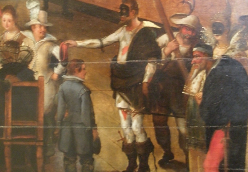 Лично я несколько раз подошел к картине Иеронима Франка I «Приход на пир». И причина не в том, что дело было перед обедом. Просто в правом углу картины подобралась подходящая компания – таинственные фигуры, у некоторых на лицах маски (явно не от свиного гриппа). Хотелось понять – что под масками. Если сравнить «пришельцев на пир» с висящей неподалеку картиной «Аллегория пяти чувств» Теодора Ромбоутса, то можно увидеть, что в «Приходе на пир» своя аллегория пяти чувств. В присутствии работ мастеров Ренессанса и Барокко все пять чувств обостряются.