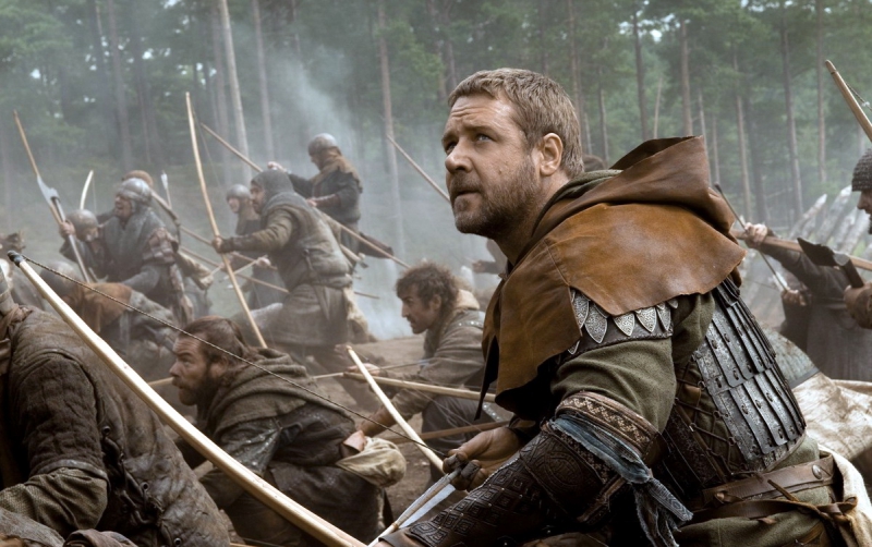Рассел Кроу, сыгравший Робина Лонгстрайда (Гуда), рассказывал, что учился стрелять из лука по двенадцать часов в день. Скорее всего, делал он этого ради своего удовольствия: в фильме за лук он берется не часто. Робин Гуд в исполнении Кроу предпочитает не бегать по Шервудскому лесу, а заниматься политикой. И ему все время везет. Видимо, сказывается умение играть в наперстки (так он проводил свободное время на службе у Ричарда Львиное Сердце).