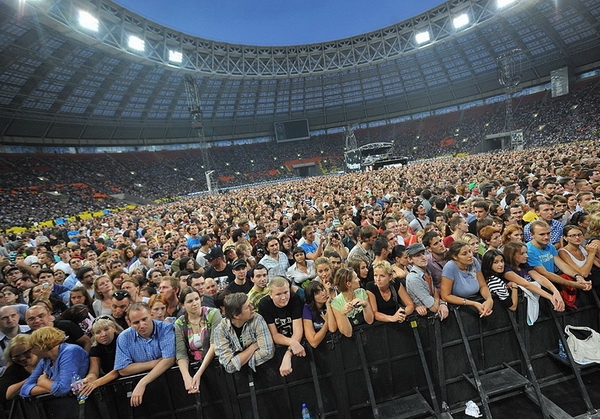 Ирландцы действительно привезли в Москву одно из лучших в мире шоу. Гигантский растягивающийся экран, движущиеся мостики, световые эффекты… А российская сторона сделала все, чтобы концерт получился неповторимым. Едва ли где-нибудь еще зрителей будут пропускать сквозь километровые (!) милицейские кордоны и то и дело покрикивать из мегафонов. Идешь сквозь милицейские цепи и ощущаешь себя заключенным в концлагере. Когда же мы поднялись в свой сектор, то обнаружили, что номера на креслах либо совсем отсутствуют, либо расставлены произвольно. Между рядов бродили растерянные зрители, безуспешно пытаясь отыскать свое место. Кроме того, кресла как будто специально испачкали к приезду U2. Некоторые барышни, явившиеся на концерт одной из лучших рок-групп мира в праздничных одеждах, были слегка озадачены. Хорошо, что при входе на трибуну раздавали красные банданы с рекламой одного из банков. Их стелили поверх пластиковых кресел.