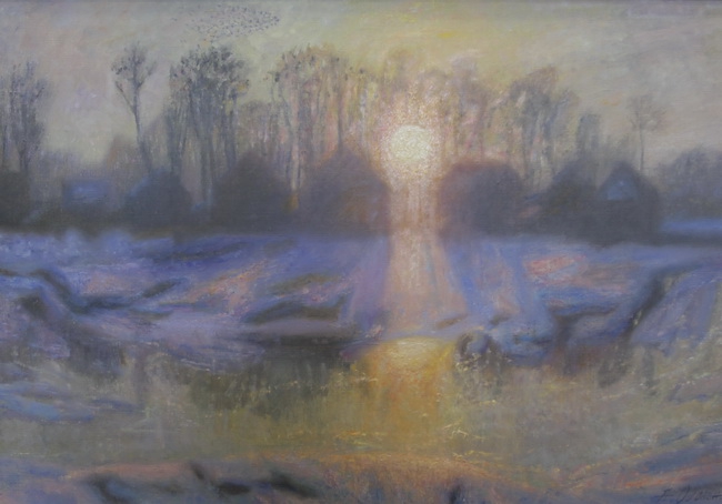 На картинах Александра Оболенского не просто свет, а естественный свет. Солнце. Причем солнце чаще всего не в зените. Очень часто закат виден даже днем. Александр Оболенский пишет деревенские пейзажи, и так как он не склонен к серьезным преувеличениям, у него получается закат деревни. Русской деревни. Это будет посильнее, чем закат Европы, например.