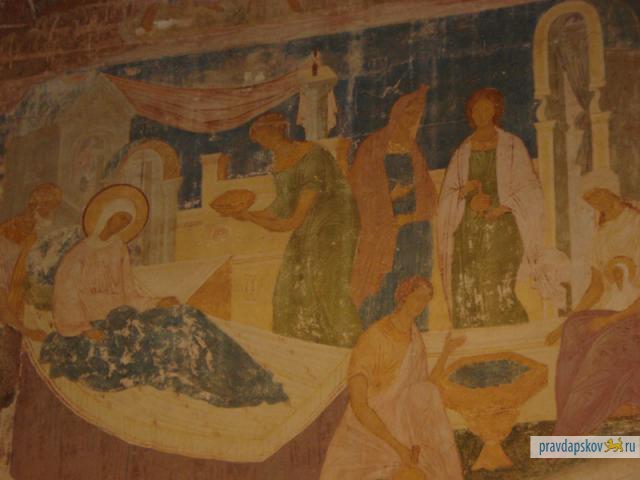 Фрески Собора Рождества Богородицы созданы псковичами в 1313 г. Это истоки псковской школы живописи, символ возрождения культуры и страны на пепелище монголо-татарского ига. В росписи псковичи применяли приемы, известные лишь итальянским мастерам. Псковские фрески отличаются свободной, экспрессивной манерой письма. Канонизированные библейские сюжеты содержат апокрифические черты, герои фресок отличаются живостью.