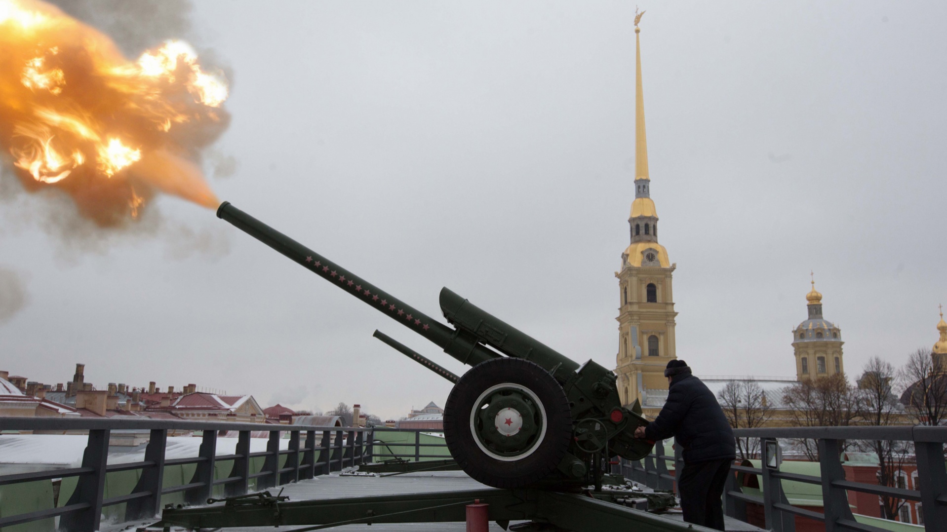 Правда, оказалось, что давать залп могут только те, кто достиг 18-летнего возраста, поэтому из пушки стреляли Александр Беглов и один из сопровождающих в поездке ребят — каждый по разу.