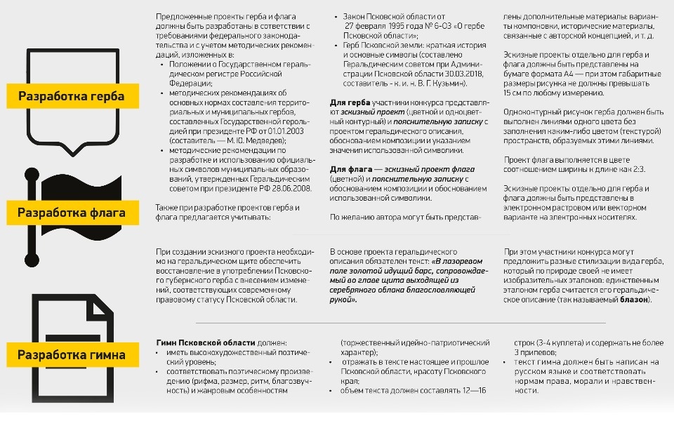 В марте по решению врио губернатора Михаила Ведерникова в Псковской области создан Геральдический совет, который должен организовать работу по разработке, согласованию с Геральдическим советом при президенте РФ и вынесению на рассмотрение областного Собрания депутатов официальных герба, флага и гимна Псковской области. По поручению руководителя региона к этой работе решено привлечь жителей области, запустив открытый творческий конкурс.