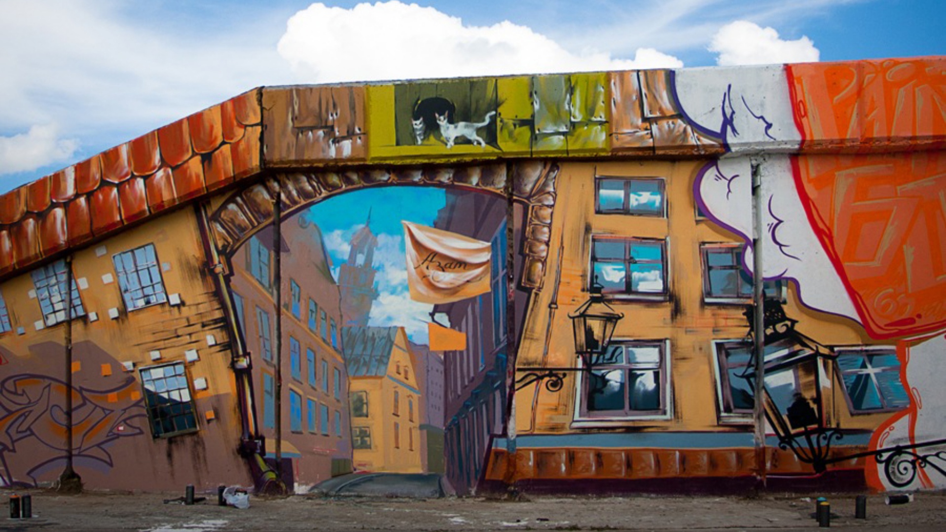 Создать оригинальные рисунки на стенах в социальных учреждениях, найти в городе площадку, где художники могут оттачивать свое мастерство, раскрасить скучные фасады серых многоэтажек, а в идеале сделать в Пскове к Ганзейским дням целую улицу арт-объектов — все это и многое другое могут участники проекта WIN WIN ART. Фестиваль в рамках проекта уже прошел в Санкт-Петербурге и в Пскове, на территории Детской деревни-SOS. На стене одного из домов там появился огромный кот, охотящийся за мышонком.