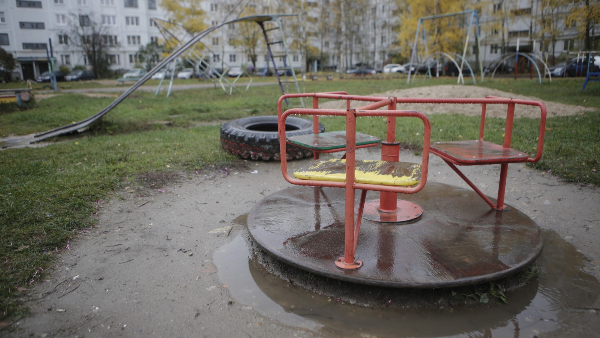Качели и горка медленно, но верно утопают в грязи и лужах.