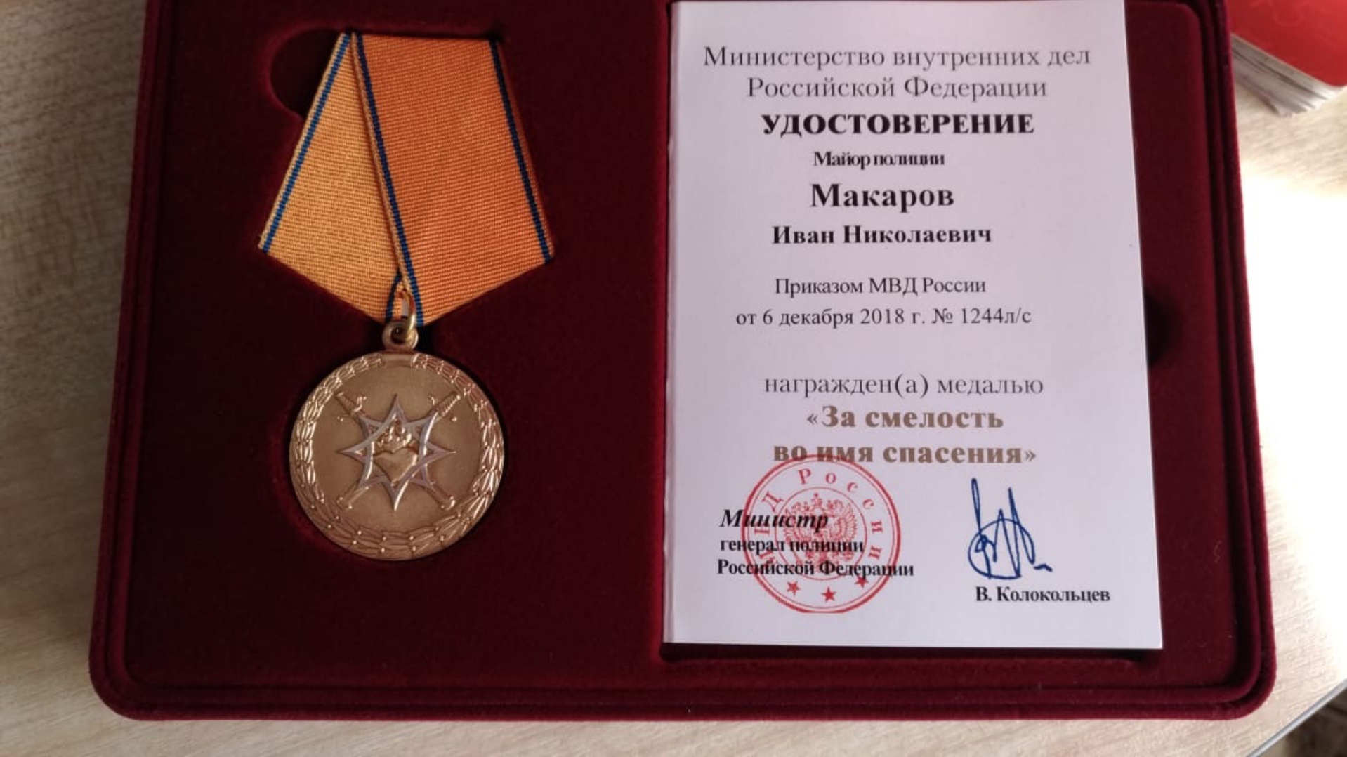 Иван Макаров получил медаль «За смелость во имя спасения» из рук министра внутренних дел Владимира Колокольцева.