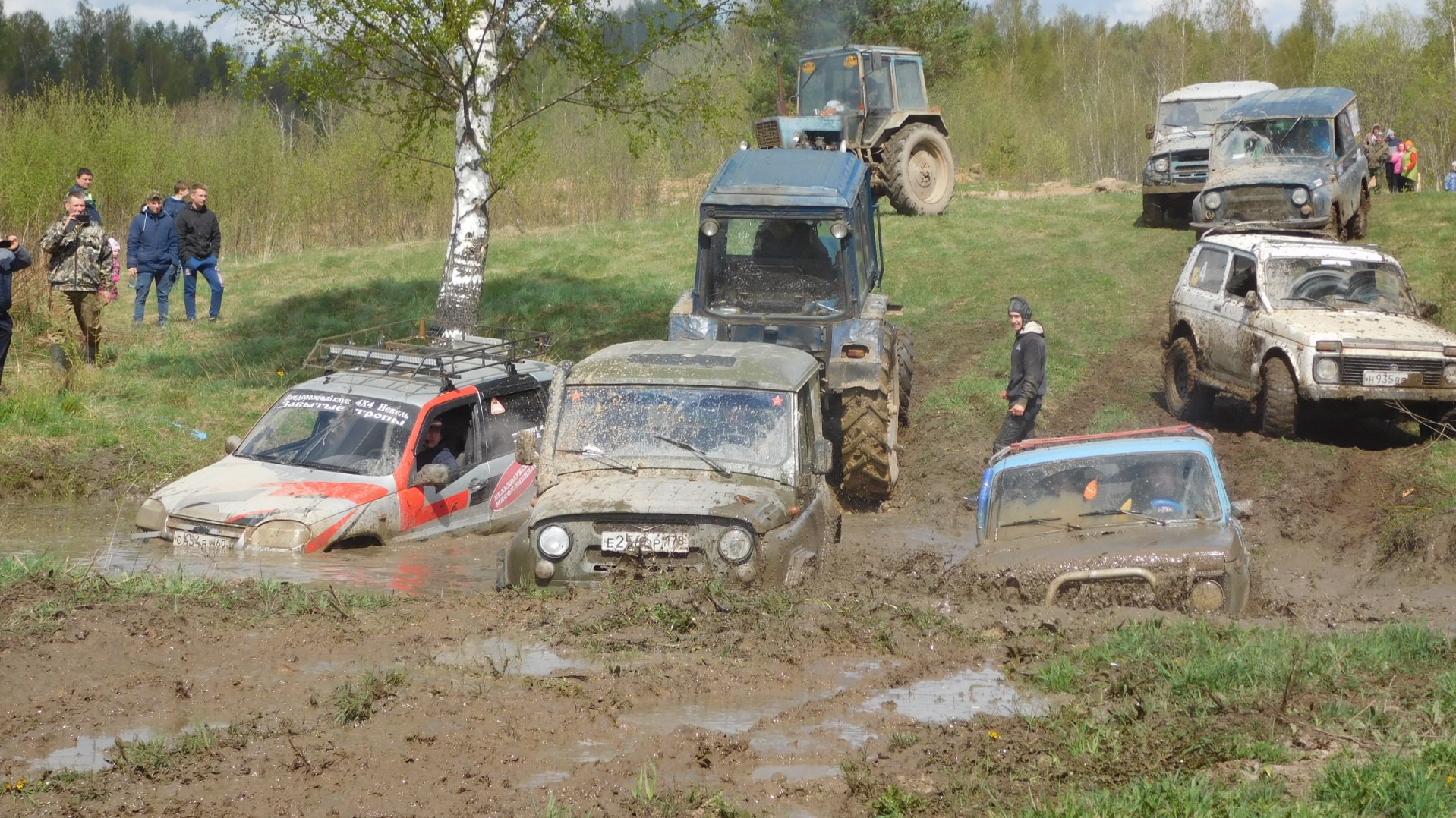 Вот очередной УАЗик крепко засел в грязи, несколько раз трактор пытался вытащить его — и каждый раз обрывал верёвочный трос. Публика уже негодовала: «Ну что ты не подготовился, трос не мог нормальный взять? Вот и сиди теперь». Некоторые экипажи даже не складывали трос в машину, он волочился следом «хвостом» — видно, так часто его доставали, что проще было не убирать. Ещё одну застрявшую машину трактором было просто не вытащить, так крепко засела. Пришлось на подмогу звать ещё один трактор, который зацепил тот тянущий трактор — и так гуськом, пыхтя и газуя, вылезли-таки из грязи.Очень порадовал участников и зрителей на первом этапе «стреляющий» УАЗик — его поездка сопровождалась такими «выстрелами» из выхлопной трубы, что все вокруг глохли. Впрочем, на последнем кругу стал глохнуть и сам УАЗик — но до старта всё равно дотянул.