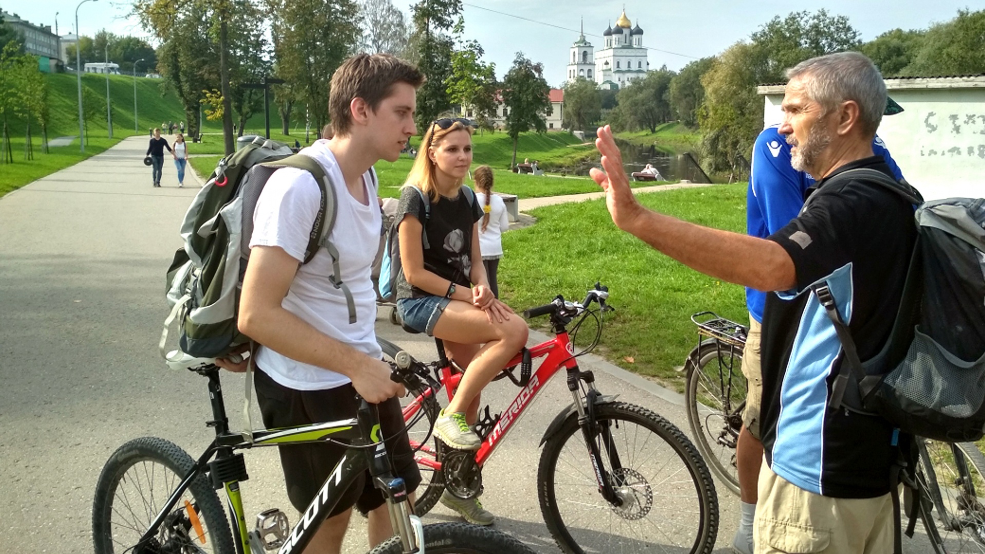Людмила Владимирова, работник городской администрации Пскова, в прошлом году создала группу из трех человек — триумвират, в котором она занималась информацией и контролем, Максим Афанасенко — технической частью, выделением велосипедов, мне, Виктору Верёвкину, досталось экскурсионное окормление. Мы, конечно, не были первопроходцами в деле велосипедных волонтерских экскурсий, но хотелось и самим попробовать, так как знания и велосипедный опыт позволяли.