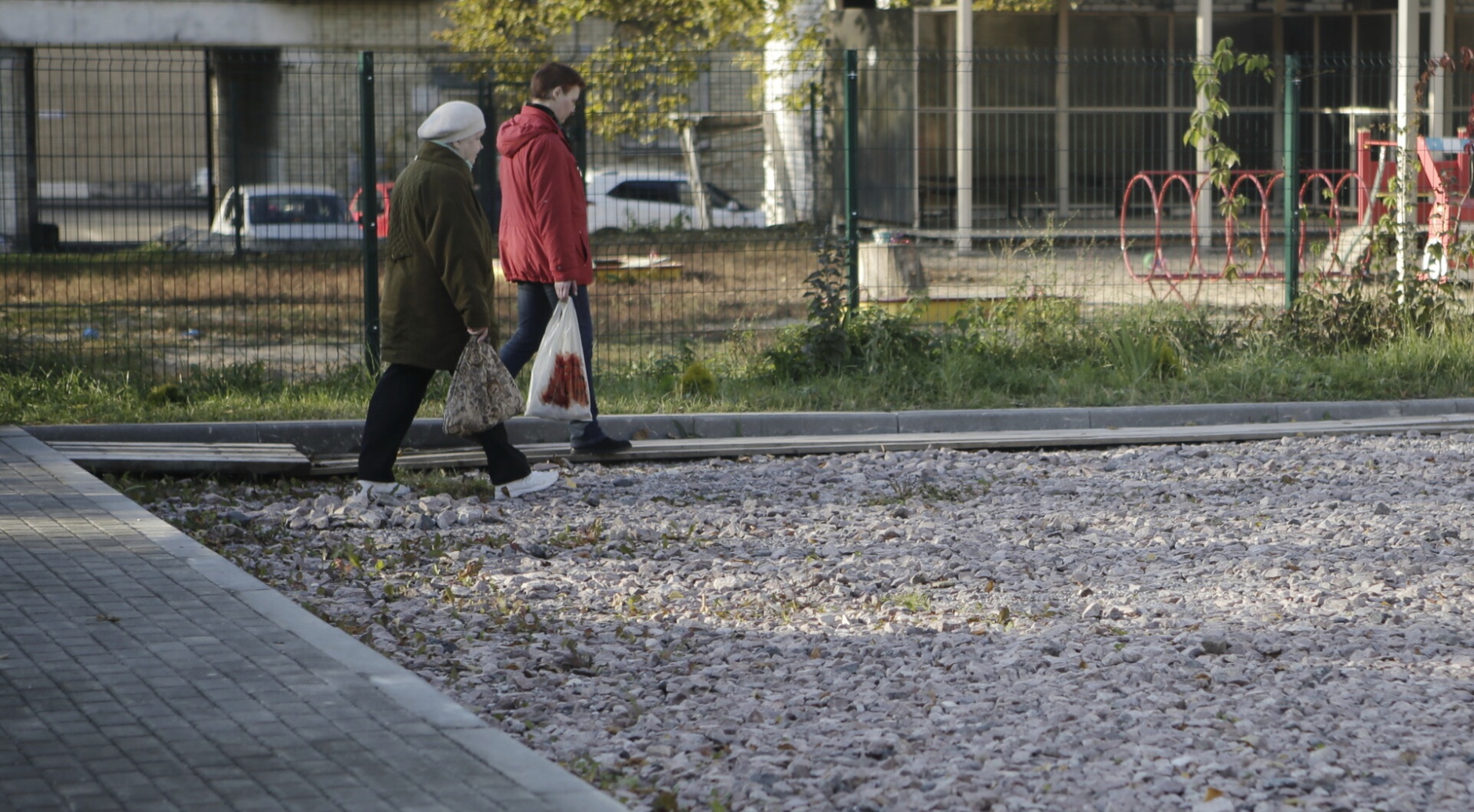 - Сделали тонкий слой щебня крупной фракции, - рассказал он о том, как такая дорожка получилась. - Затем засыпали щебнем более мелкой фракции. Положить асфальт поверх будет технически неправильно: вода не будет дренировать, будут перепады по высоте — так как слой асфальта будем выше сантиметров на пять, чем примыкающая дорога.