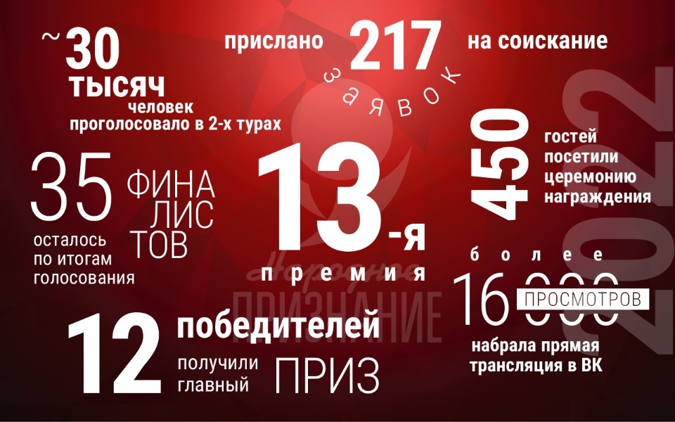 Что отличало «Народное признание-2022» от предыдущих премий, так это, пожалуй, результаты голосования — и народного, и экспертов. Во многих номинациях судьбу награды определили всего несколько десятков голосов. Тем не менее, абсолютно точно можно говорить о том, что все номинанты на награду — победители. Благодаря проекту, о них узнали десятки тысяч человек — только в двух турах голосования приняли участие порядка 30 тысяч жителей самых разных регионов России.