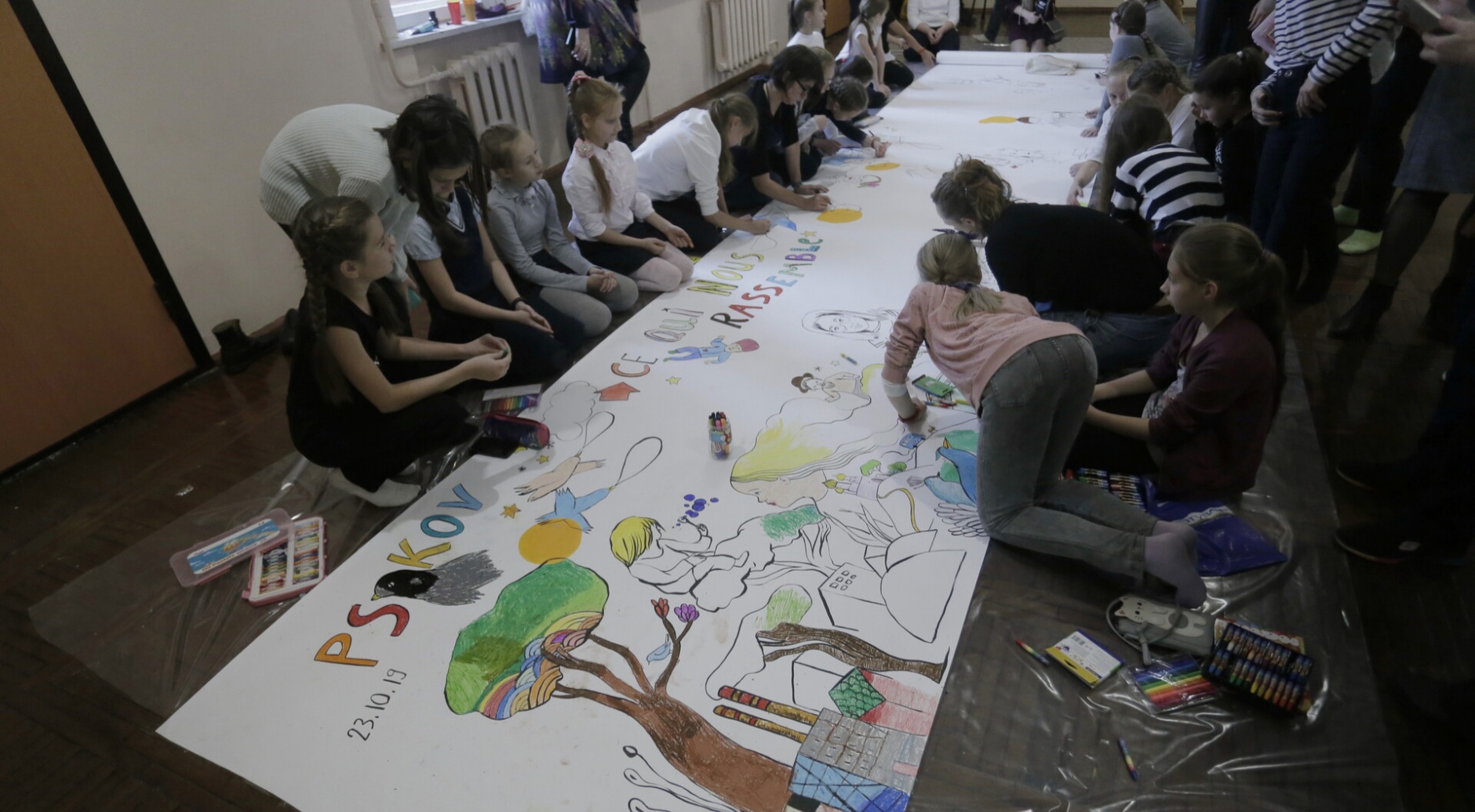 В одной из рекреаций Псковского педагогического комплекса 23 октября царило необычное оживление. Скинув обувь, удобно расположившись на полу и вооружившись кисточками, красками, мелками и фломастерами, человек тридцать ребят и взрослых сосредоточенно трудились над созданием одной большой иллюстрации. Сначала на полотне появились оранжевые круги — опорные точки композиции. А потом «Воображаемый сад», именно так назвали работу авторы идеи — французские художницы Кароль Ше и Жюдит Гейфье, стал наполняться обитателями: деревьями, птицами, животными и даже детьми. Причем мальчики и девочки на иллюстрации — это портреты не воображаемых, а вполне реальных псковских школьников. «Псковская правда» побывала на мастер-классе.
