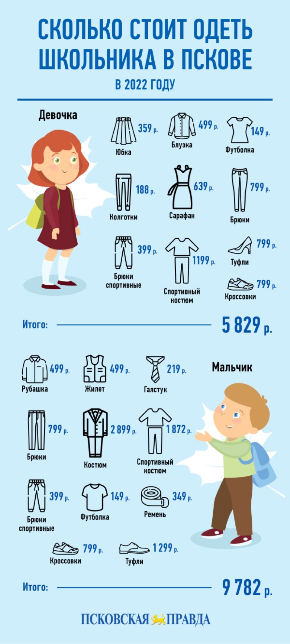 По расчетам «Псковской правды», основанным на ценах интернет-магазина крупной федеральной сети детских товаров, за комплект для девочки (если купить самые дешевые вещи) придется заплатить 5 829 рублей. Он будет состоять из блузки (499 рублей), юбки (359 рублей), сарафана (639 рублей), брюк (799 рублей) и колготок (188 рублей). Для занятий физкультурой потребуется футболка (149 рублей) и спортивные брюки (399 рублей) и/или спортивный костюм (1 199 рублей). Из обуви — туфли и кроссовки (по 799 рублей).