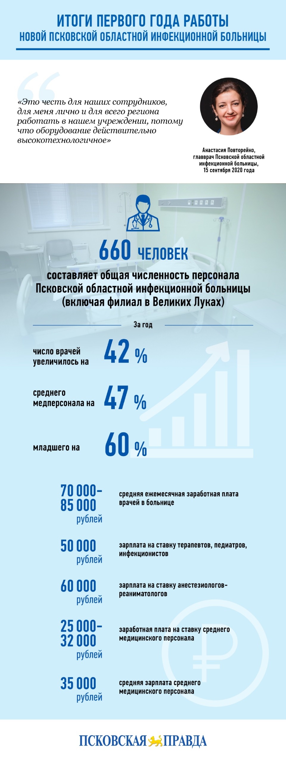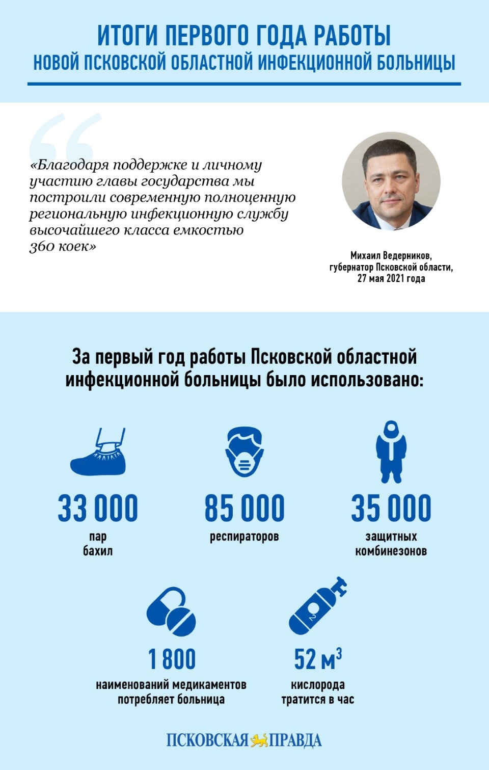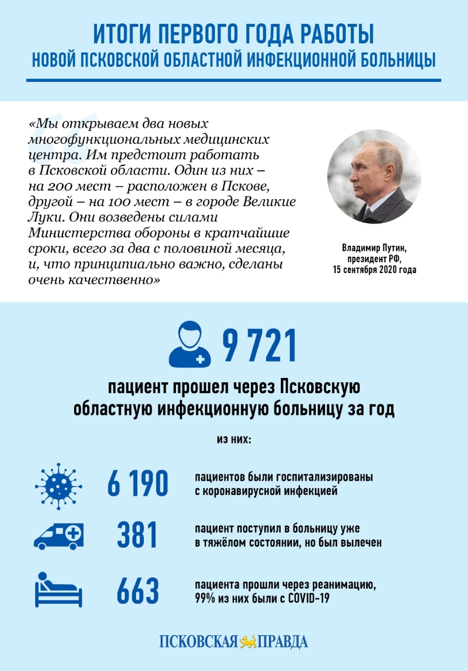 Ровно год назад, 5 октября 2020-го, начала прием пациентов Псковская областная инфекционная больница. Медучреждение, построенное Минобороны РФ с нуля в рекордные 72 дня, позволило поднять на кардинально новый уровень борьбу с коронавирусом в регионе. «Псковская правда» узнала, как больница прожила этот год, и собрала инфографику на основе этих данных.
