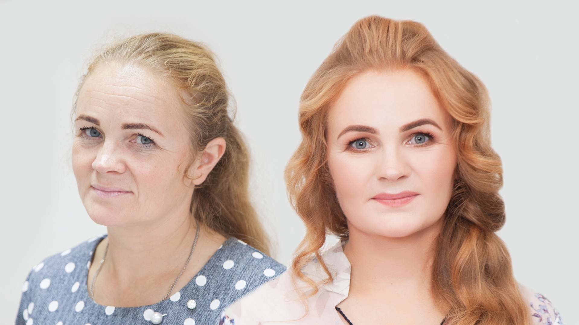 Нашей героине я сделала легкие смоки-айз, используя тени теплых песчаных оттенков, а вдоль линии роста ресниц нанесла бронзовые тени, чтобы подчеркнуть радужку и сделать более выразительным голубой цвет глаз Елены. Нижнюю слизистую я проработала жемчужным сияющим карандашом, чтобы освежить взгляд. Нанесла румяна персиково-коричневого оттенка, которые гармонируют с теплым оттенком волос героини.